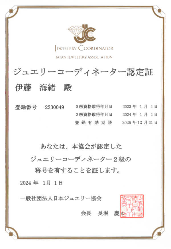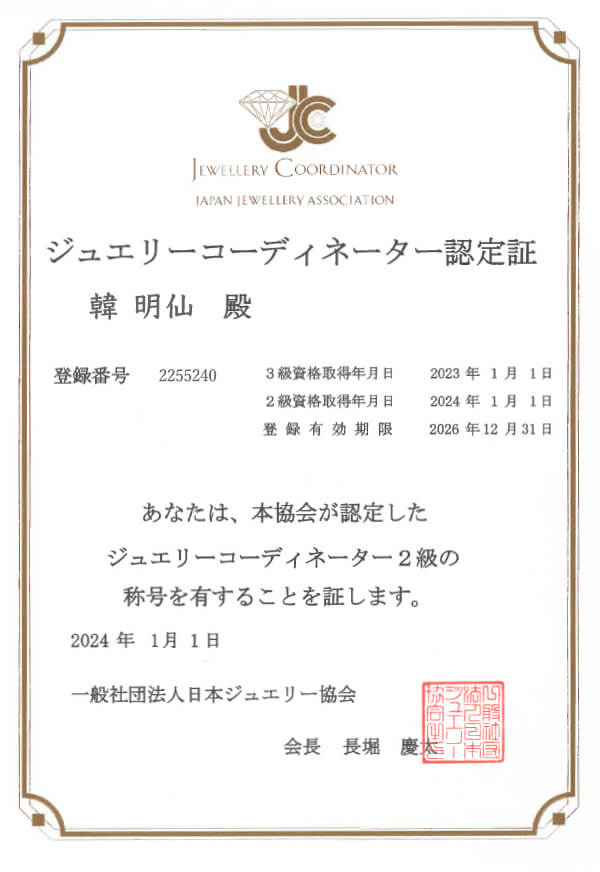 宝石業界で権威のある一般社団法人日本ジュエリー協会(Japan Jewellery Association 略称「JJA」)に加盟しております。