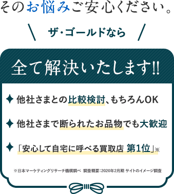 無店舗型のサービスの場合、どんな人が査定に来るのか不安。ザ・ゴールドは、店頭買取・出張買取・宅配買取をバランス良く行っているため、安心してご利用いただけます。