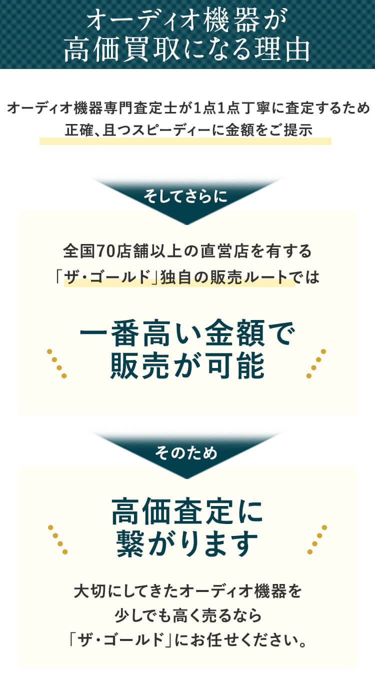 ザ・ゴールドのオーディオ機器買取・出張買取は、1点1点丁寧に査定させていただき、適正金額のご提示をお約束します。オーディオ機器の買取査定金額の「なぜ?」にもしっかりお答えしますので、お気軽にご質問ください。