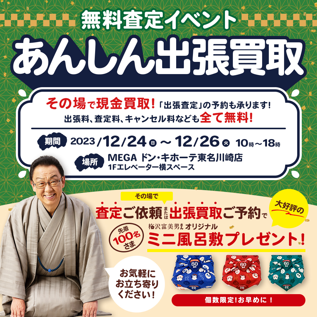 その場で査定をご依頼・出張買取をご予約いただいた先着100名様に、「梅沢富美男さんのオリジナル風呂敷」をプレゼントいたします。数に限りがありますので、ぜひお早めにご利用ください。