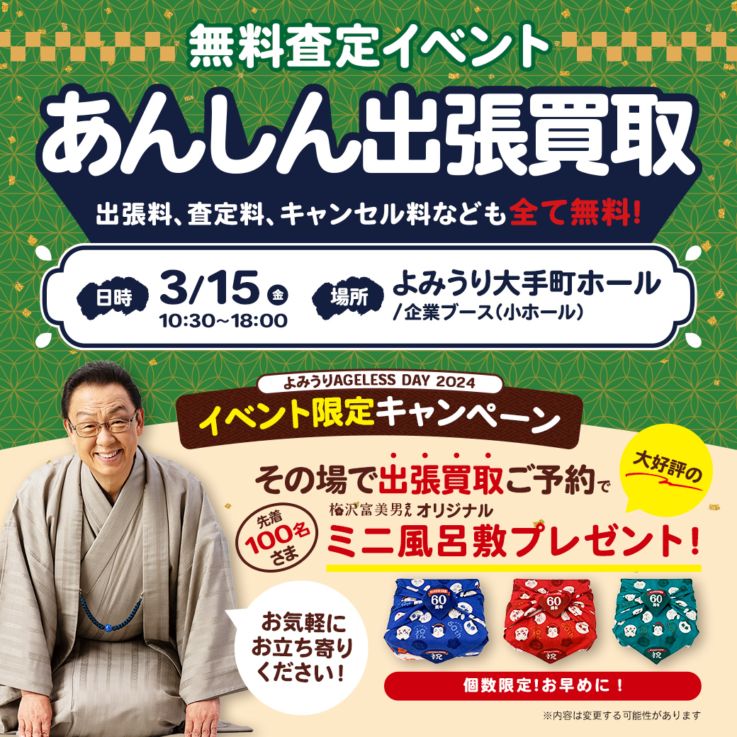 その場で査定をご依頼・出張買取をご予約いただいた先着100名様に、「梅沢富美男さんのオリジナル風呂敷」をプレゼントいたします。