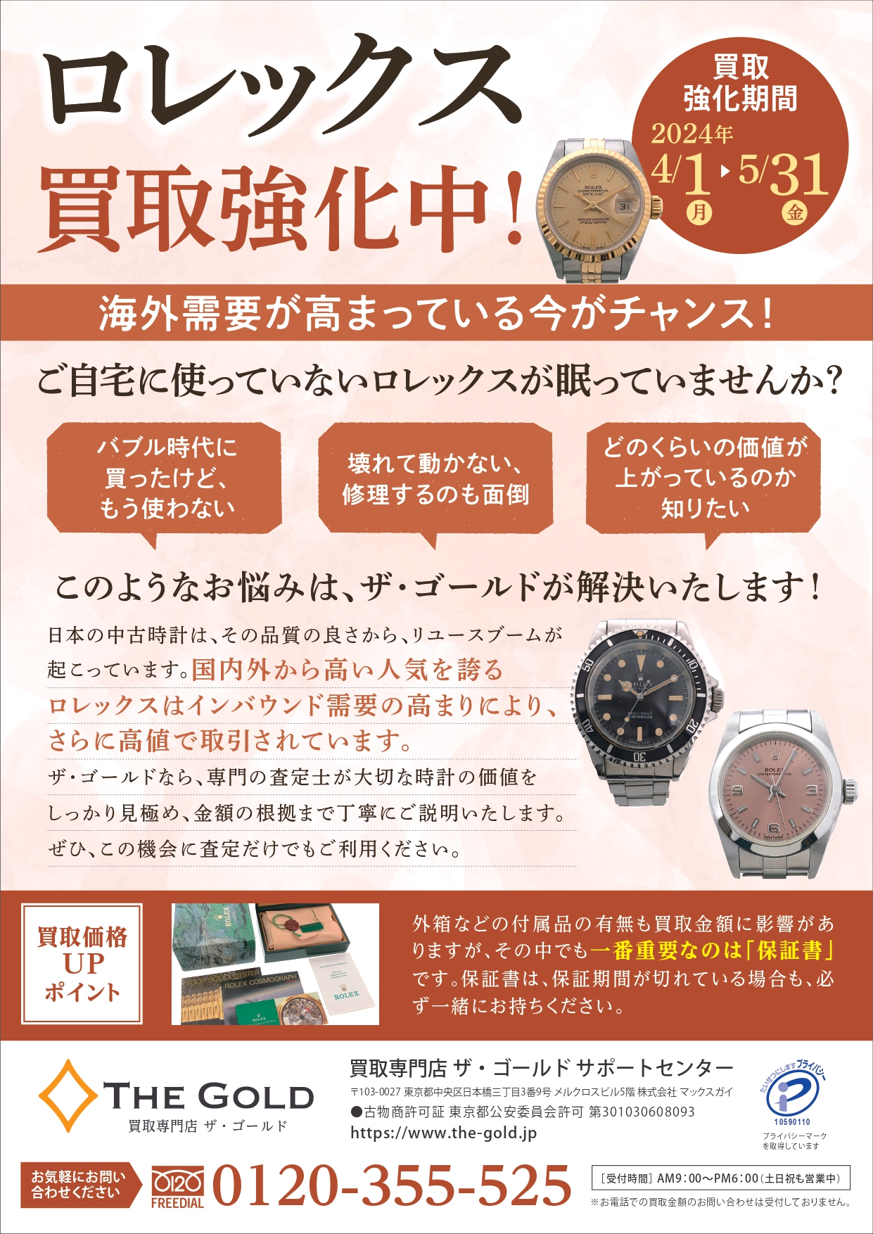 日本の中古時計は、その品質の良さから、リユースブームが起こっています。国内外から高い人気を誇るロレックスは特にインバウンド需要の高まりにより、さらに高値で取引されています。ザ・ゴールドなら、専門の査定士が大切な時計の価値をしっかり見極め、金額の根拠まで丁寧にご説明いたします。