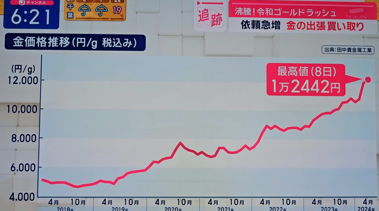 2024年4月8日(月)放送のテレビ朝日「スーパーJチャンネル」さまに、金相場の高騰について、取材していただきました。