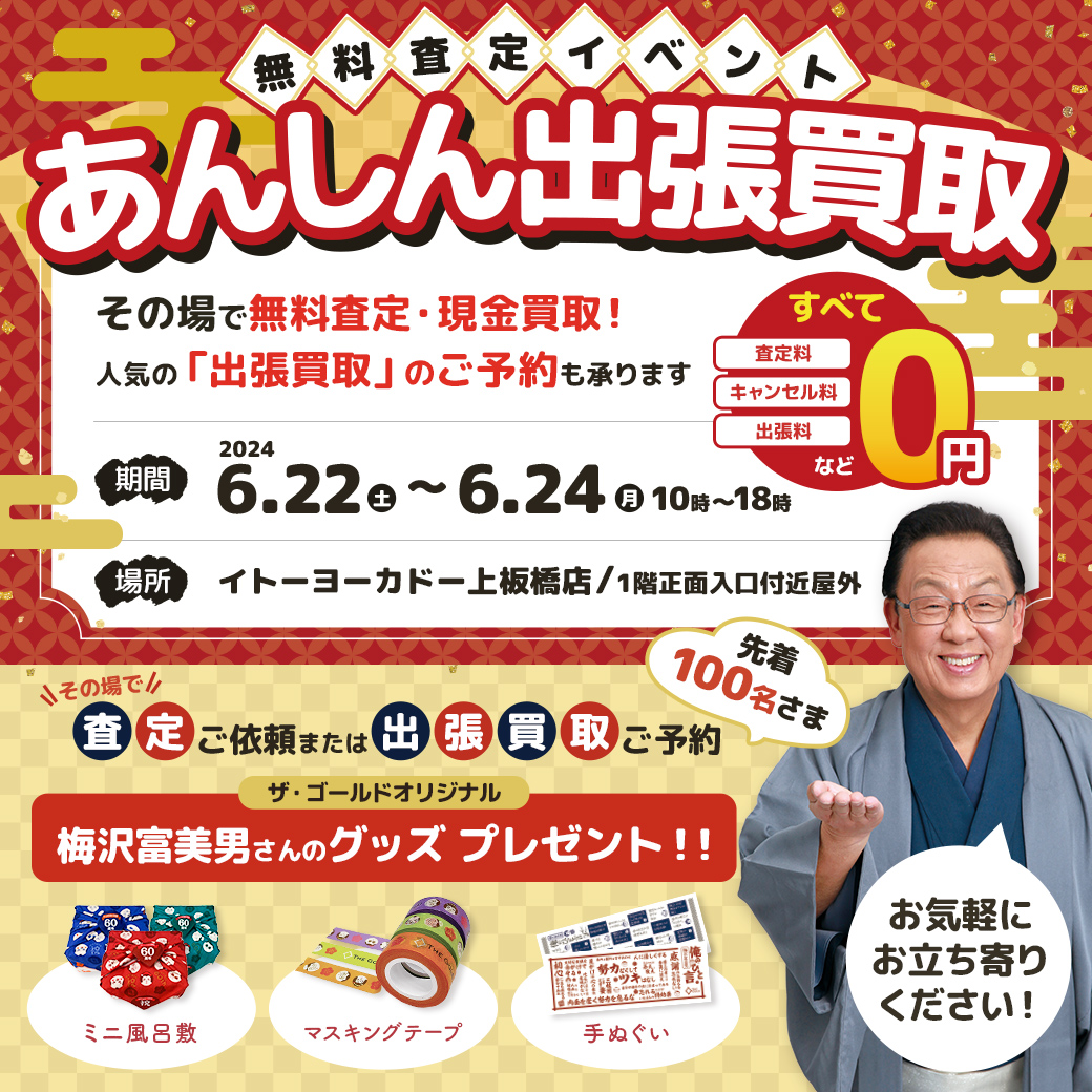 その場で査定をご依頼・出張買取をご予約いただいた先着100名様に、ザ・ゴールドオリジナル「梅沢富美男さんのグッズ」をプレゼントいたします。数に限りがありますので、ぜひお早めにご利用ください。