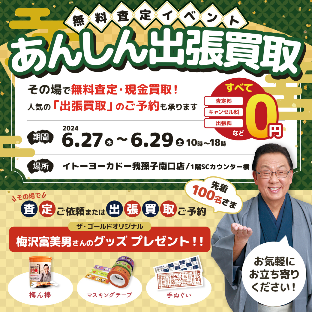 その場で査定をご依頼・出張買取をご予約いただいた先着100名様に、ザ・ゴールドオリジナル「梅沢富美男さんのグッズ」をプレゼントいたします。数に限りがありますので、ぜひお早めにご利用ください。
