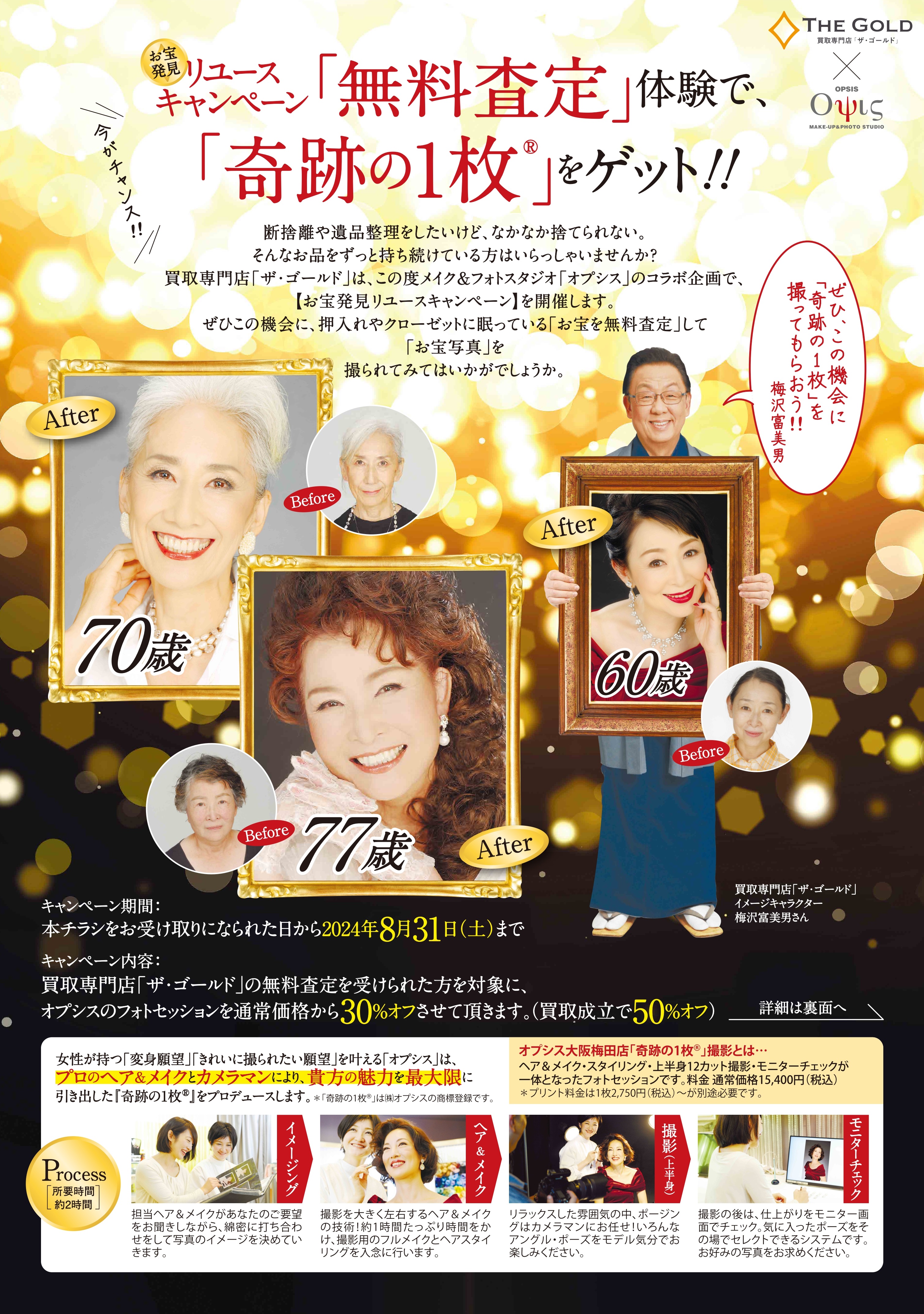 ザ・ゴールドの無料査定をご利用いただくと、「オプシス大阪梅田店」さまの写真撮影が30%オフになります。さらに、ご成約いただいた場合は、写真撮影が50%オフになります。