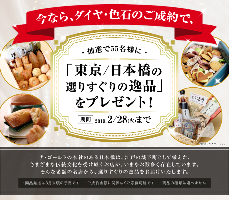 【内容】 期間中にザ・ゴールドでダイヤモンドや色石などの宝石をご成約された方の中から抽選で55名様に「東京/日本橋の選りすぐりの逸品」をプレゼント!