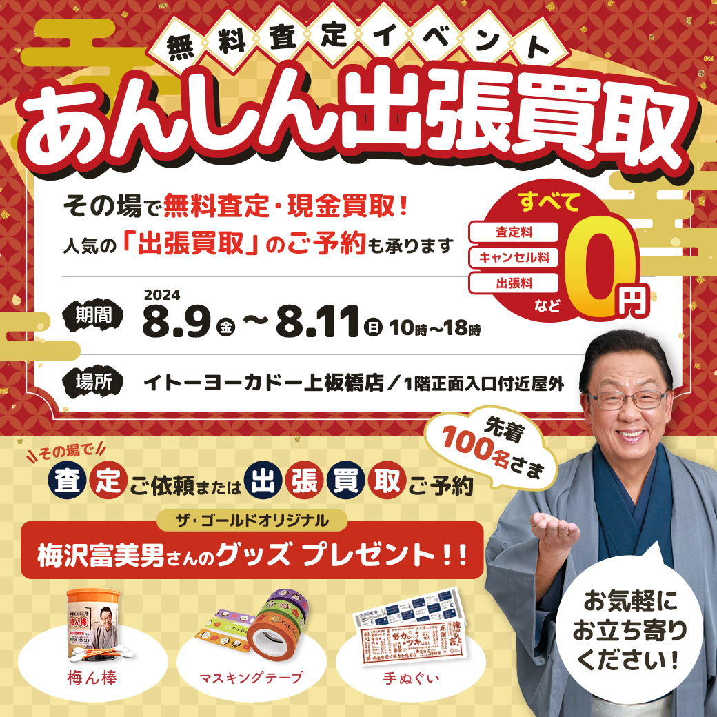その場で査定をご依頼・出張買取をご予約いただいた先着100名様に、ザ・ゴールドオリジナル「梅沢富美男さんのグッズ」をプレゼントいたします。数に限りがありますので、ぜひお早めにご利用ください。