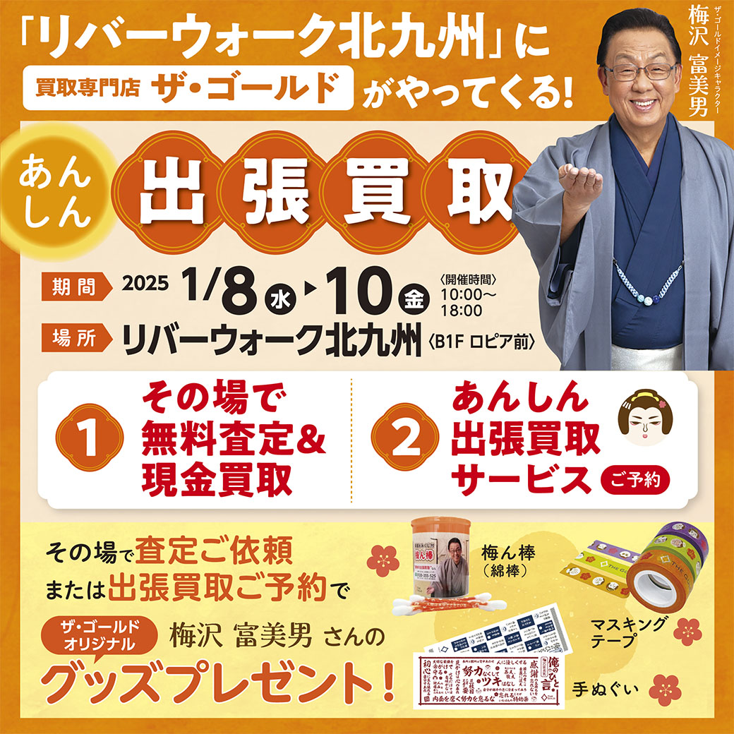 その場で査定をご依頼・出張買取をご予約いただいたお客さまに、「梅沢富美男さんのオリジナルグッズ」をプレゼントいたします。数に限りがありますので、ぜひお早めにご利用ください。
