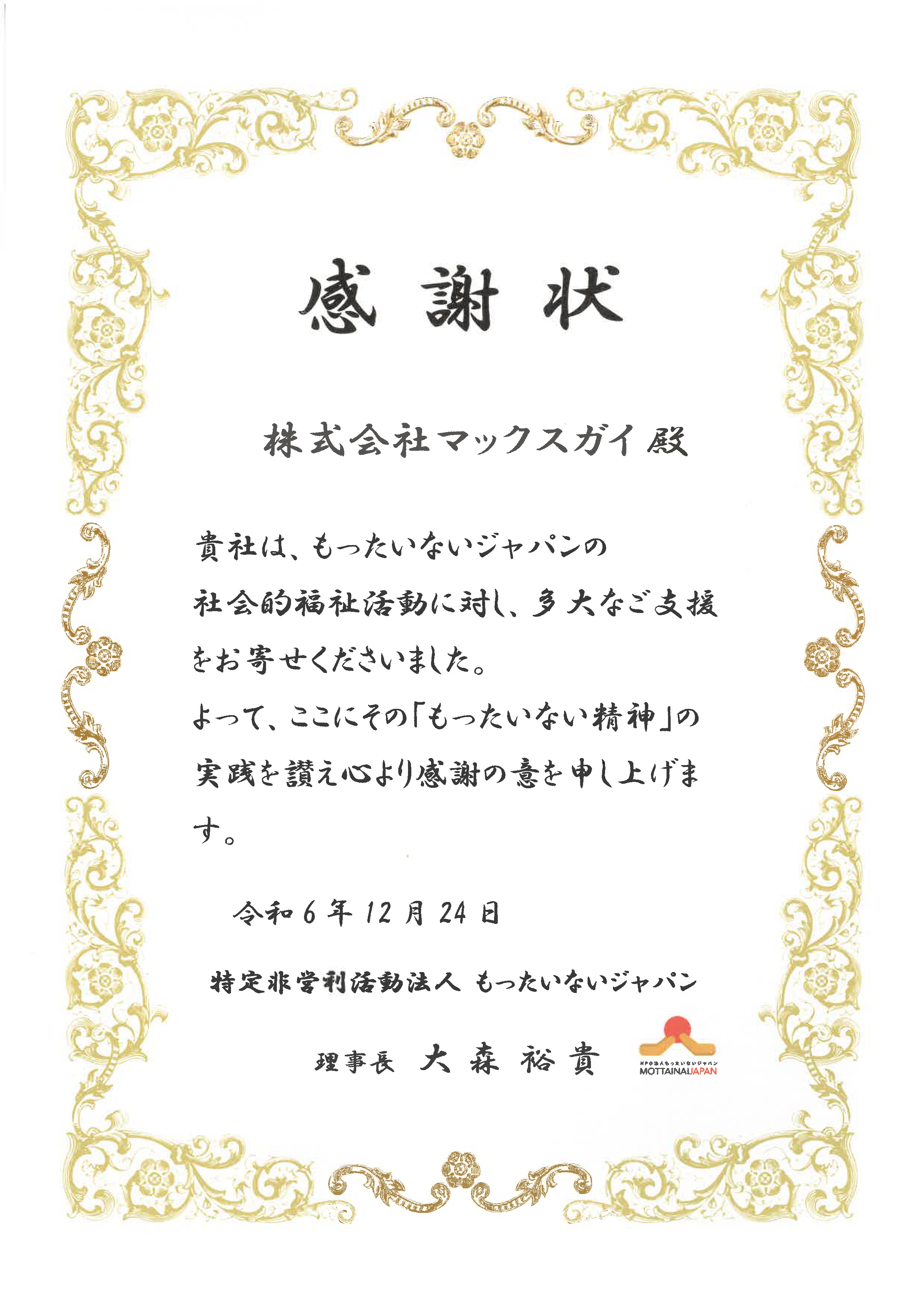 以上のお送り先である特定非営利活動法人「もったいないジャパン」さまより、感謝状をいただきました。