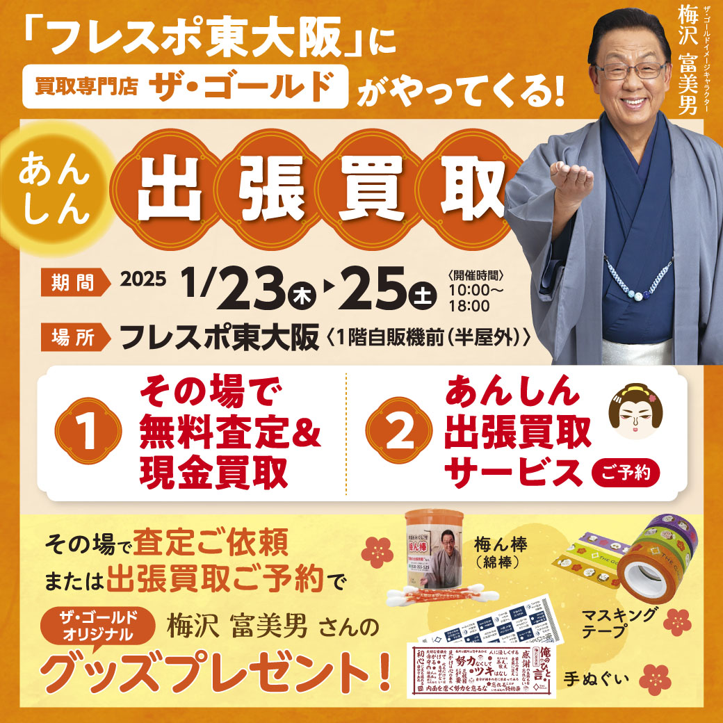 その場で査定をご依頼・出張買取をご予約いただいたお客さまに、「梅沢富美男さんのオリジナルグッズ」をプレゼントいたします。数に限りがありますので、ぜひお早めにご利用ください。