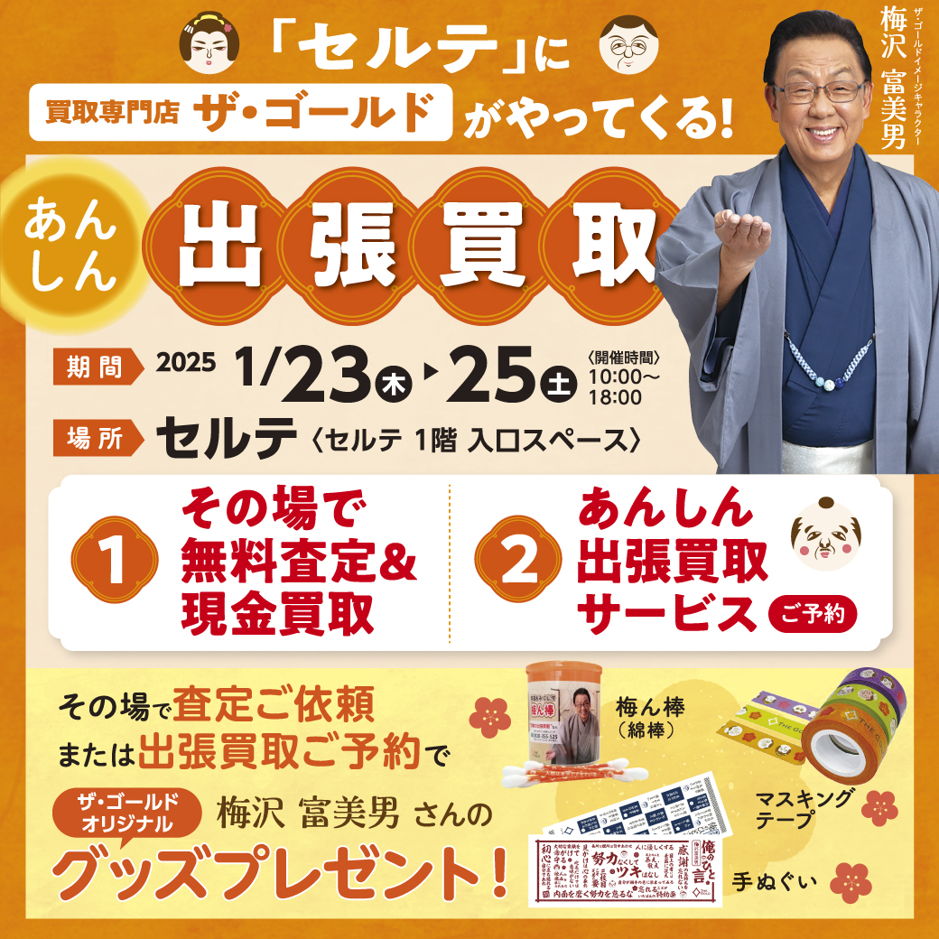 その場で査定をご依頼・出張買取をご予約いただいたお客さまに、「梅沢富美男さんのオリジナルグッズ」をプレゼントいたします。数に限りがありますので、ぜひお早めにご利用ください。