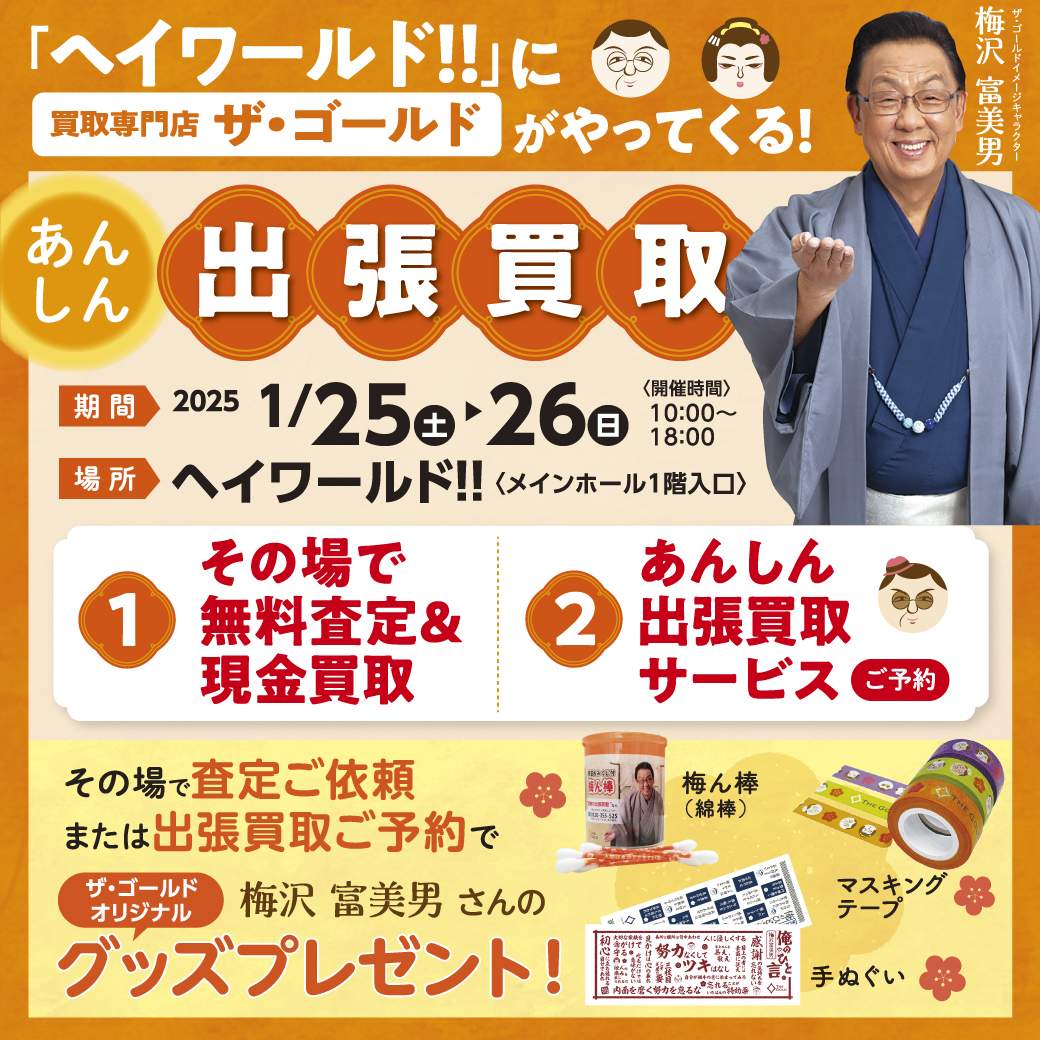 その場で査定をご依頼・出張買取をご予約いただいたお客さまに、「梅沢富美男さんのオリジナルグッズ」をプレゼントいたします。数に限りがありますので、ぜひお早めにご利用ください。