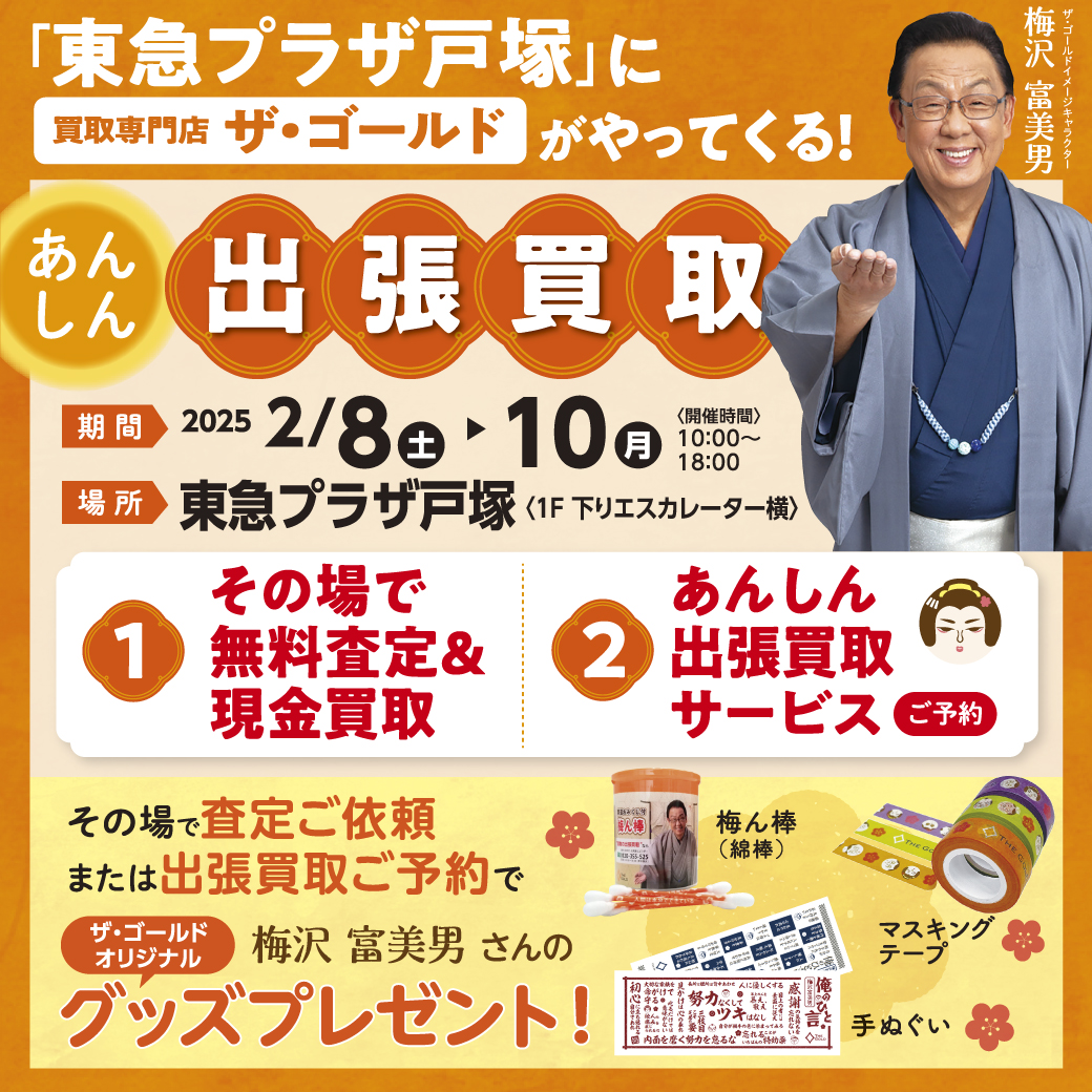 その場で査定をご依頼・出張買取をご予約いただいたお客さまに、「梅沢富美男さんのオリジナルグッズ」をプレゼントいたします。数に限りがありますので、ぜひお早めにご利用ください。