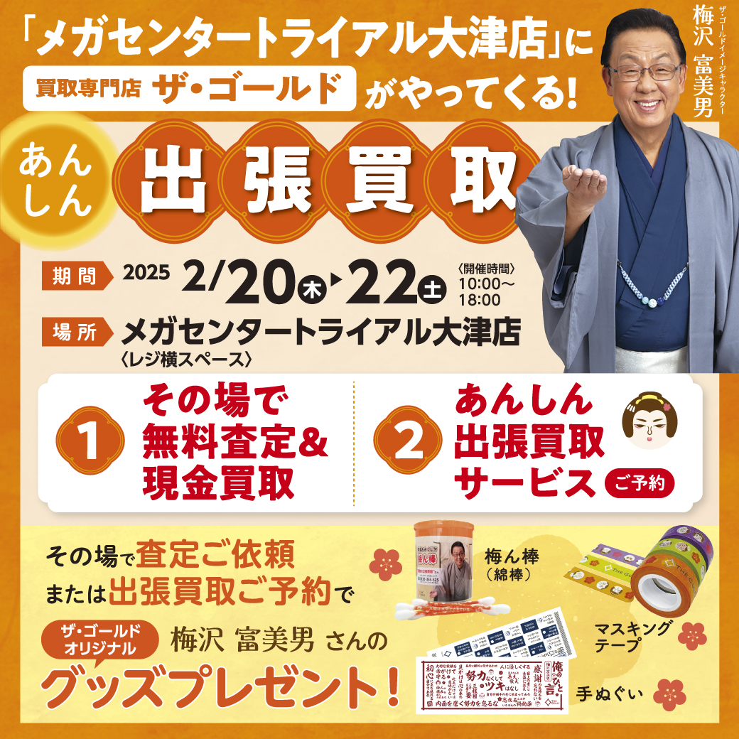 この度、熊本県の「メガセンタートライアル大津店」さまにて、THE GOLDの無料査定イベントを開催いたします。