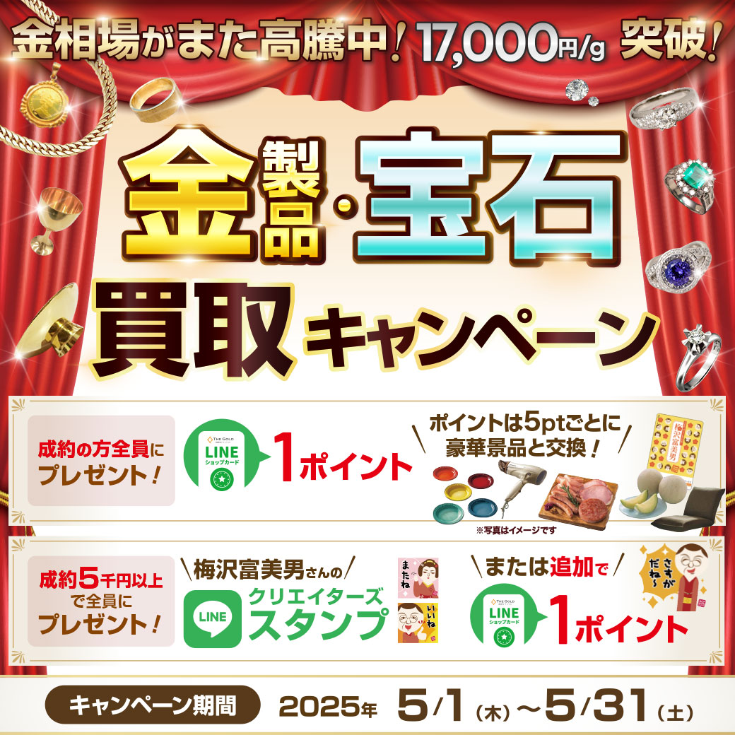 ザ・ゴールドでは、過去最高水準を更新したこと記念して、5月1日より、金製品・宝石買取キャンペーンを開始いたしました。