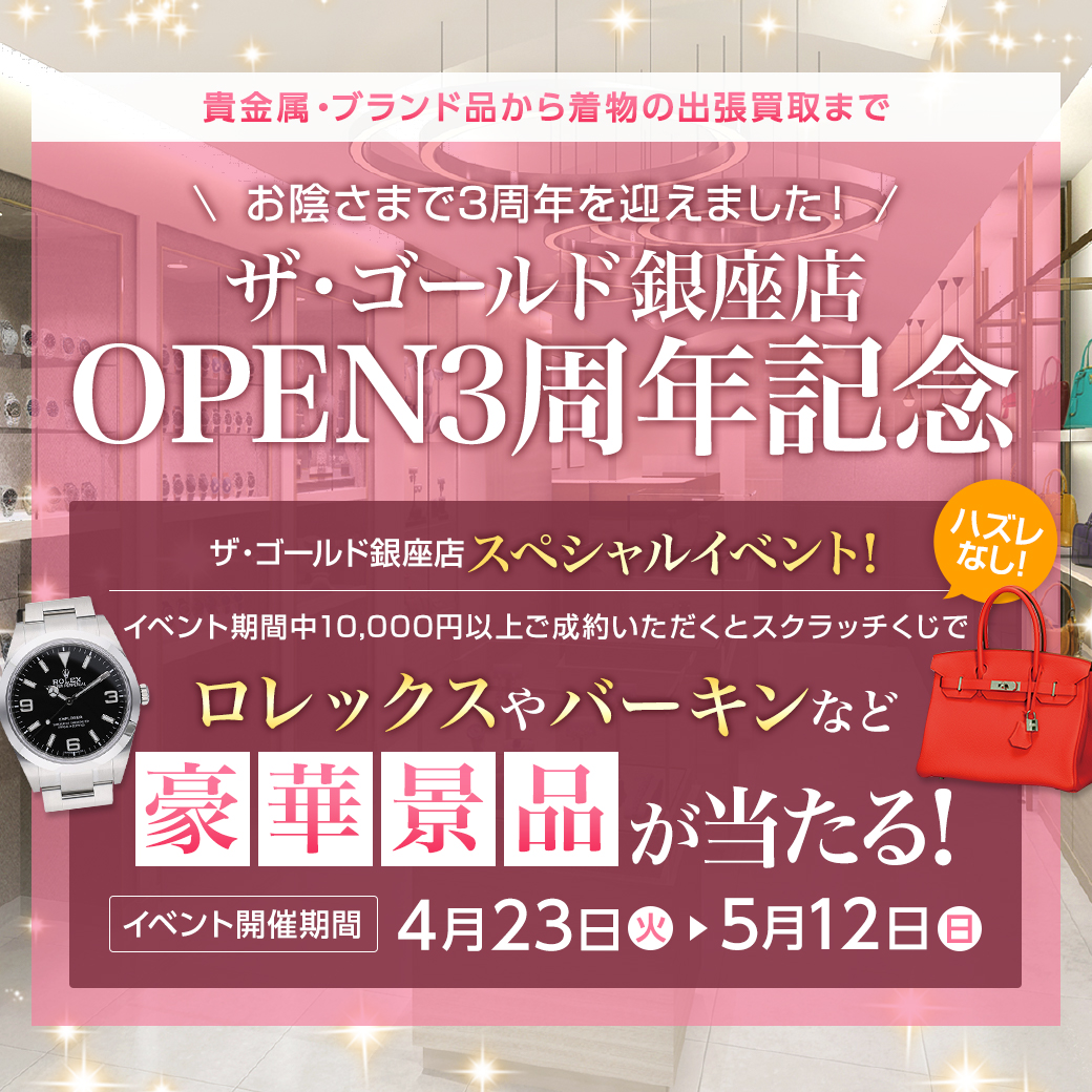 2019年4月23日(火)朝10時より、ザ・ゴールド銀座店にて3周年記念キャンペーンを開催します。