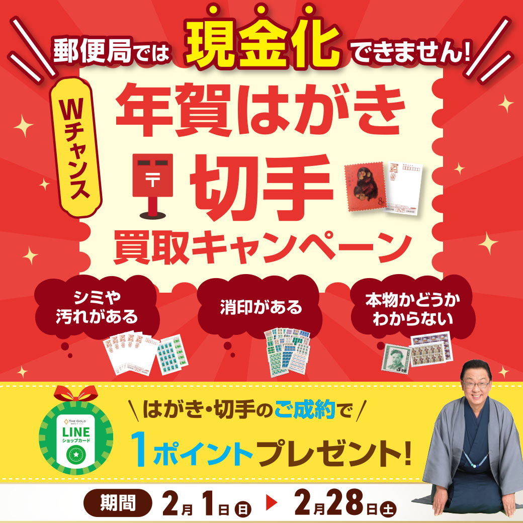 ザ・ゴールドでは、2月1日より、年賀はがき・切手買取キャンペーンを開始しました。 一枚からでも、最新の市場価格に基づき、国内外の幅広い販路を活かして一点一点誠実に査定いたします。