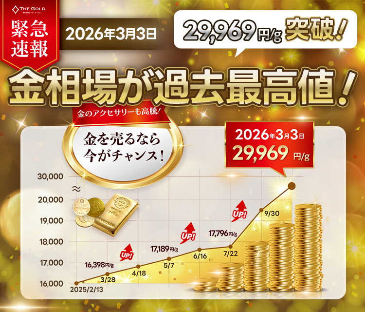 記録的な高値更新が続く中で、現在「ザ・ゴールド」では、店頭買取だけでなく出張・宅配買取のご依頼を非常に多くいただいております。 ご自宅やご実家に眠っている金製品は、まさに今、高く売る最大の好機を迎えています。
