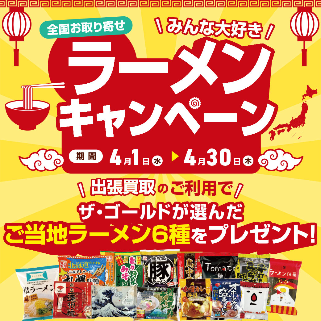 4月は特別企画として、ザ・ゴールドの出張買取をご利用いただくと「ご当地ラーメン6種の詰め合わせ」 が必ずもらえる「みんな大好きラーメンキャンペーン」を開始いたします。
